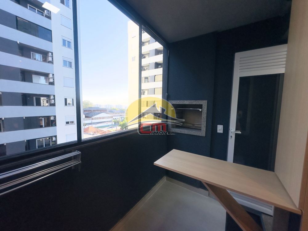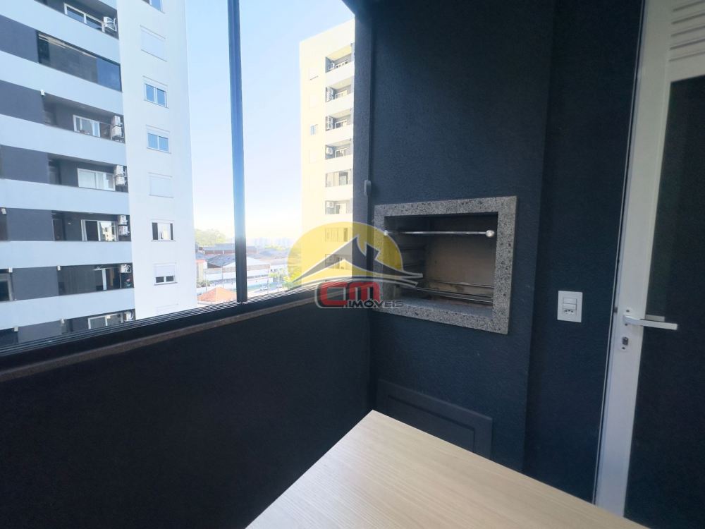 - Sacada fechada com vidro, equipada com churrasqueira e um móvel de apoio;
