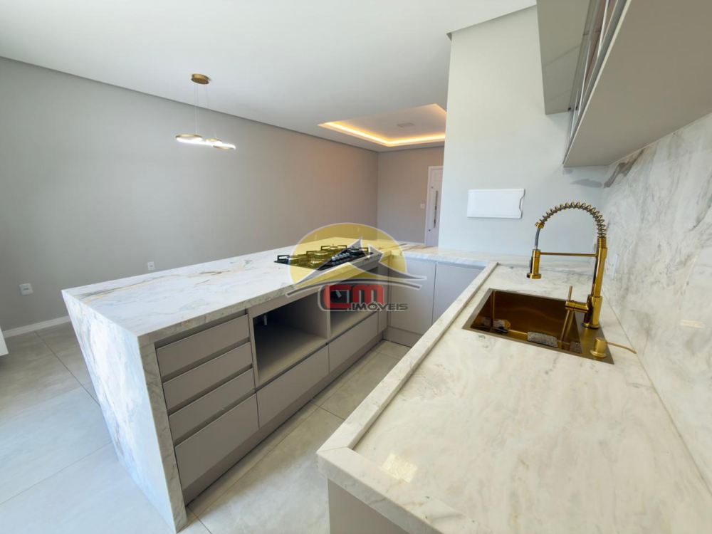 - Sala e cozinha integradas, com móveis planejados e bancada em mármore e lareira embutida no painel da tv.